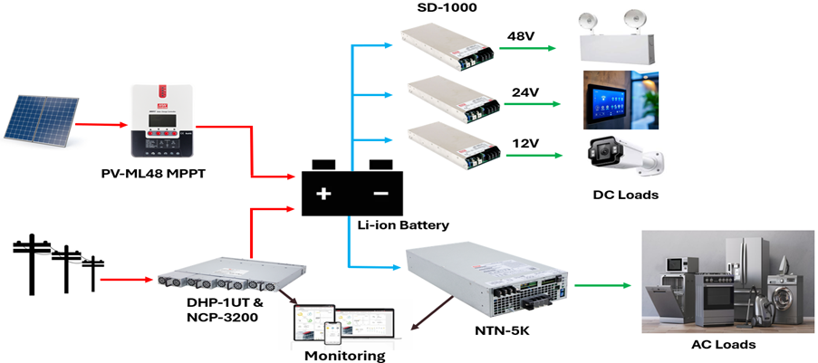 MEAN WELL’s high-reliability power platform offers multiple series that can be seamlessly integrated to support residential and commercial ESS applications. The SD-1000 DC-DC converters provide efficient and isolated power conversion for multiple DC rails, such as 48 VDC for emergency lighting, 24 VDC for home smart controllers, and 12 VDC for CCTV cameras. The NTN-5K DC-AC inverters deliver stable, pure sine wave AC power to critical loads including household appliances, HVAC systems, and EV chargers, ensuring reliable operation under varying load conditions. Meanwhile, the NCP-3200 AC-DC chargers draw power from the utility grid or from a solar inverter and charge the battery bank with high efficiency and precise charging profiles, forming a complete and flexible ESS power backbone with MEAN WELL components.