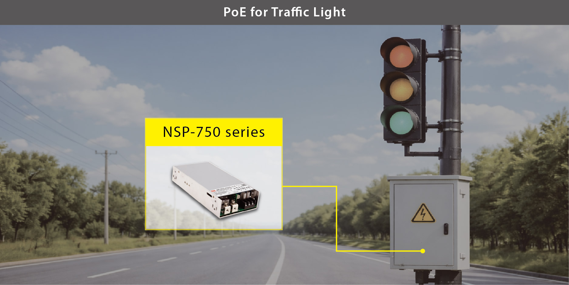 The Traffic Control System requires a power supply capable of operating at an ambient temperature of 74°C due to outdoor installation while delivering 480W of output power. The NSP-750 series is the ideal solution, as it supports reliable PoE operation across an extended working temperature range of –40°C to +85°C, ensuring stable performance in harsh outdoor conditions.