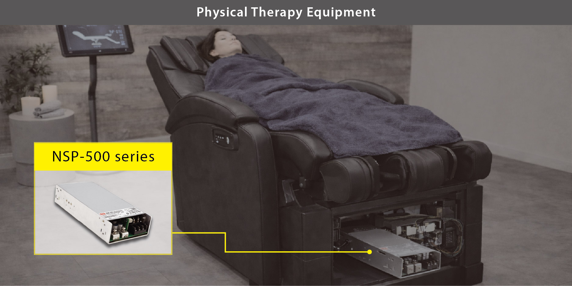 The application Regulatory Standard UL1647 requires a power supply certified to UL 62368 with extra-low leakage current (500 µA) for enhanced safety. This requirement is met by the NSP-500 series, which is Globally certified to 62368-1, 60601-1, 60335-1, 61558-1 / 2-16, 61010-1, and 62477-1, and delivers an extremely low leakage current of less than 350 µA, making it ideal for Therapy Euipment applications.