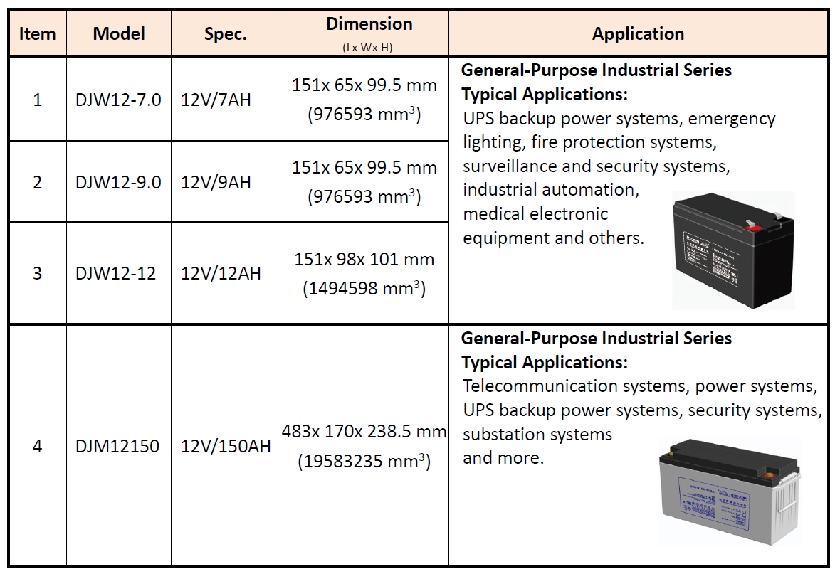 DJW / DJM Series: 12V/7~12AH & 150AH Valve Regulated Sealed Lead Acid Batteries
